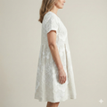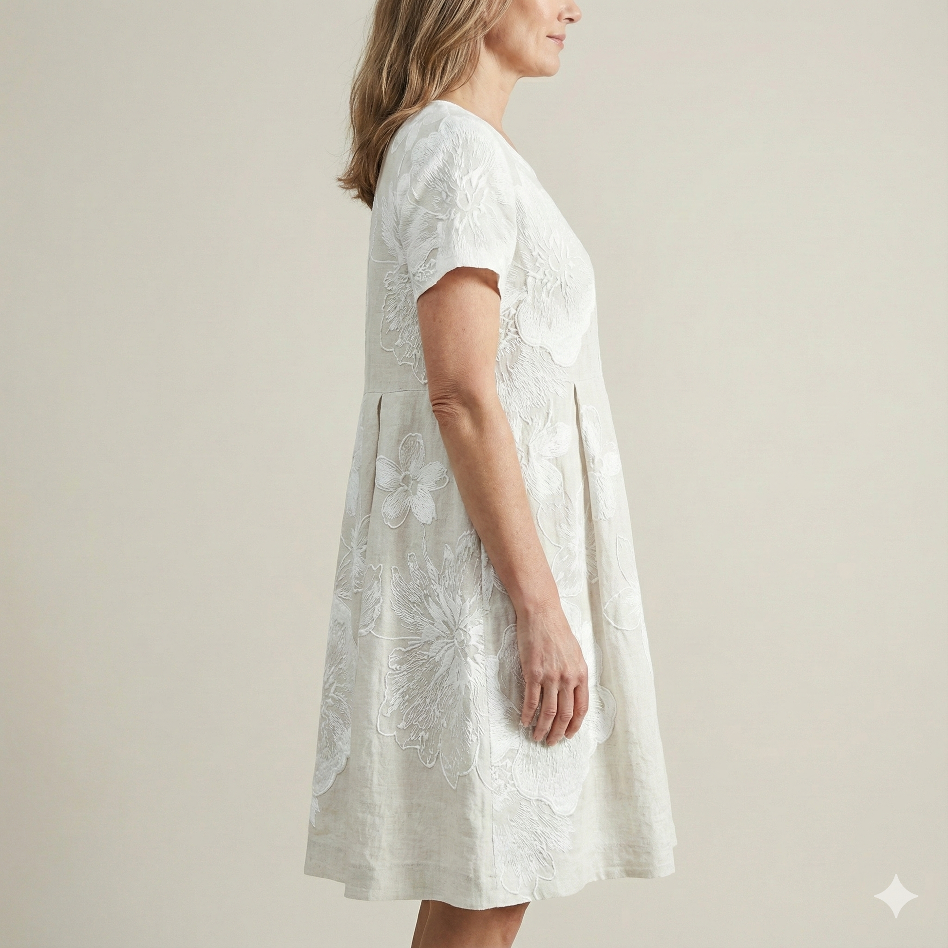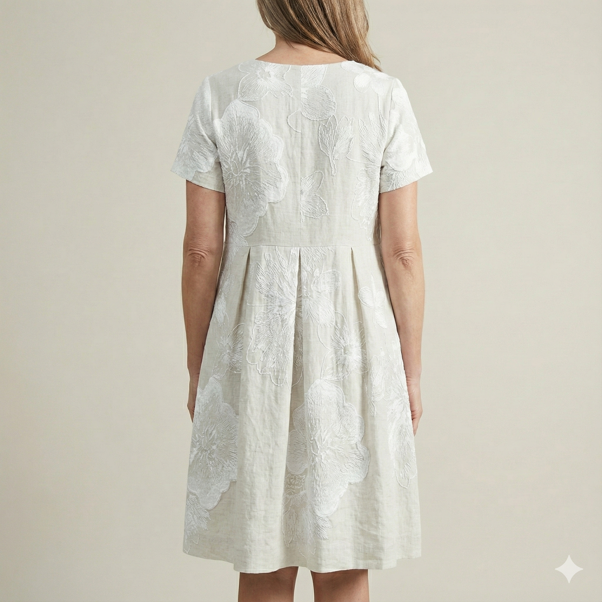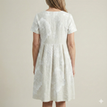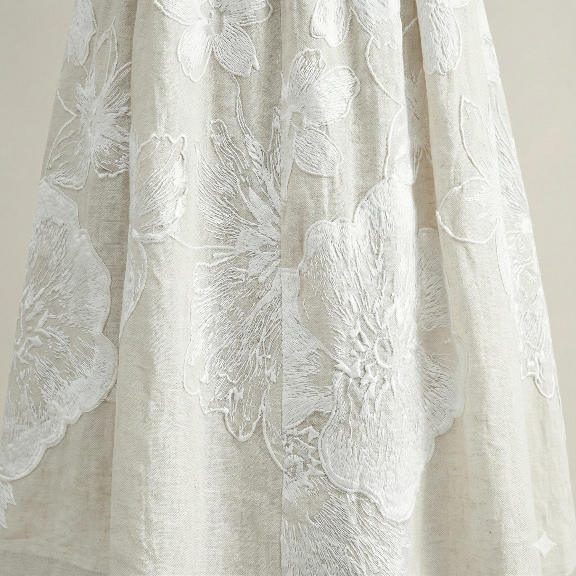 Elegant white embroidery inspired by nature, showcased beautifully in our floating-dress detail shot.